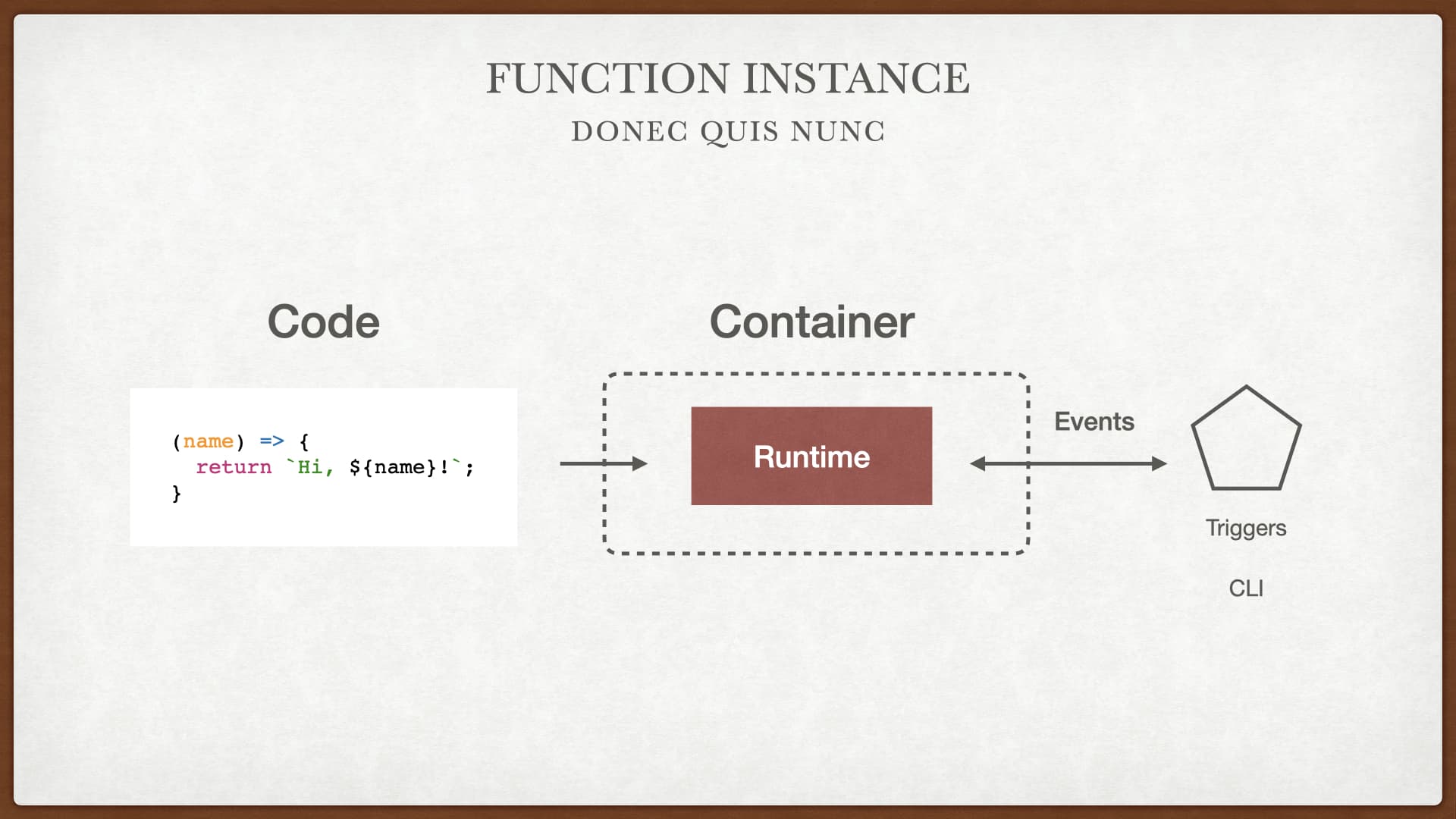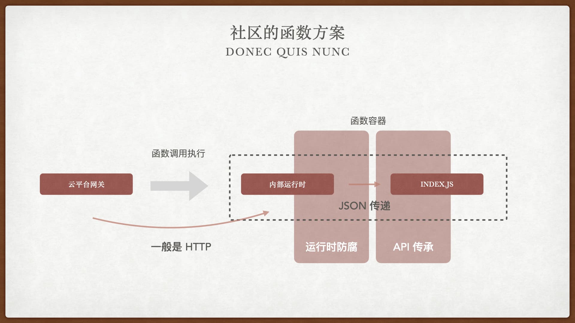 整个运行时处在最中间的部分,往上承接事件带来的数据,接收,中转,往下调用到业务代码,把中转的参数传入,在整个容器中占了非常重要的部分 。一般来说,整个运行时包括几个部分,一是语言的 VM,基建的 SDK 等等,比如 Node.js 10/12,日志采集模块等等,二是运维的脚本,用来控制启停,健康检查等等,第三块就是运行时实际代码,简单的实现的话,可以理解起了个 http 服务,并在其中加载业务函数的代码。