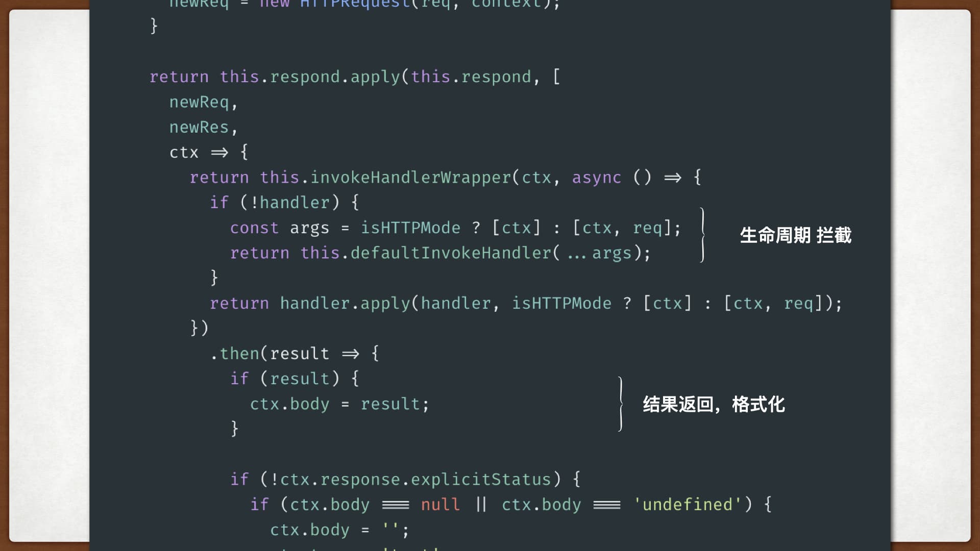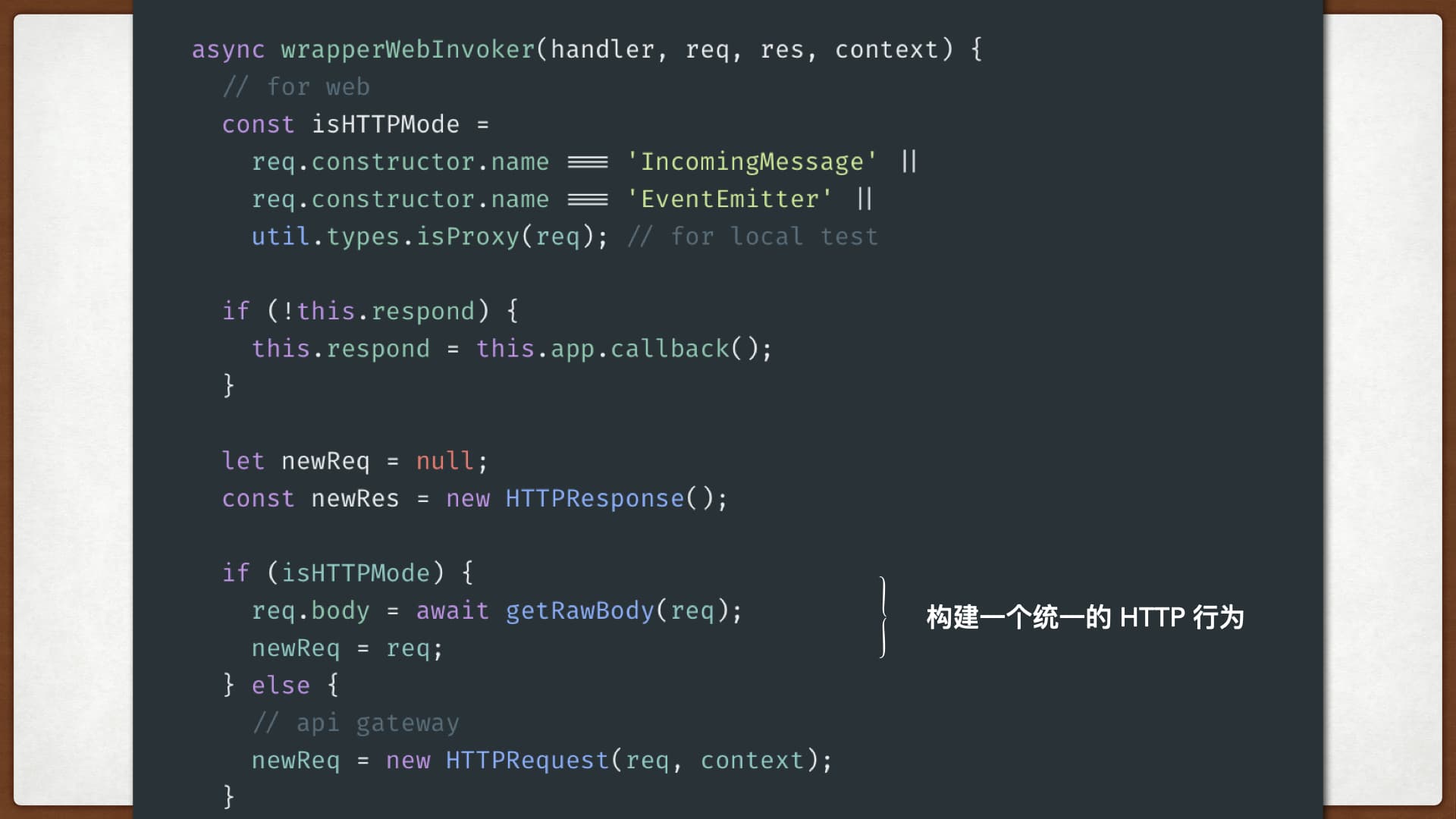 在 Web 的处理方法中,进一步细化内容,比如判断是否是网关的类型,构造出一个类似 koa ctx 的结构,处理 body 参数等。