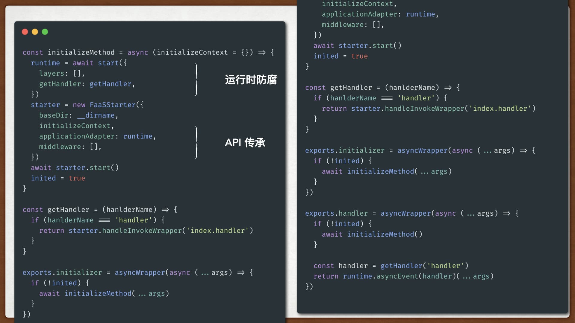 为了和之前的框架结合,以及屏蔽不同平台之间的差异,我们在社区的运行时执行之后,用户入口函数之前,做了一层架构抽象,即我们所谓的”防腐层“。这层一共包括两个功能,一是运行时防腐的部分,屏蔽出入参数差异,屏蔽异步差异,错误处理等等。第二部分是 API 传承,将传统的 Midway v1 的容器初始化,根据 yml 里的信息实例化对应的函数方法。